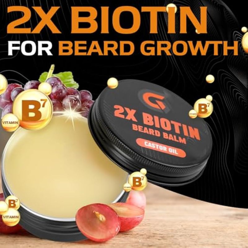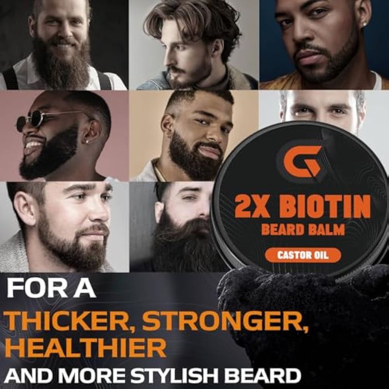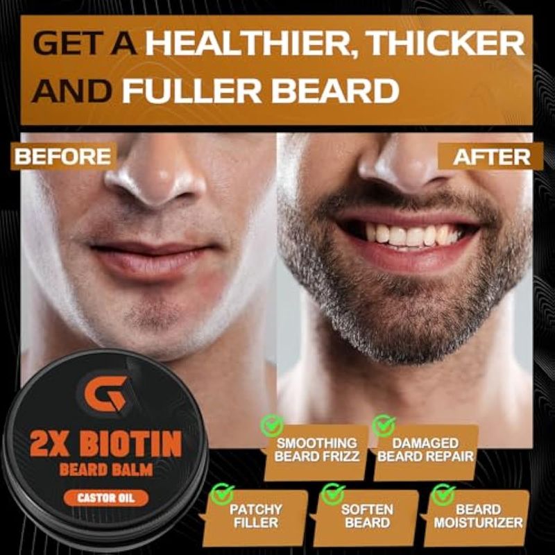 BáLSAMO PARA BARBA DE BIOTINA, ACONDICIONADOR Y MANTEQUILLA VEGANA, CERA SUAVIZANTE DE BIGOTE NATURAL PURA CON ACEITE DE RICINO, ESPESANTE DE VELLO FACIAL, HIDRATANTE, FORTALECEDOR Y CREMA DE