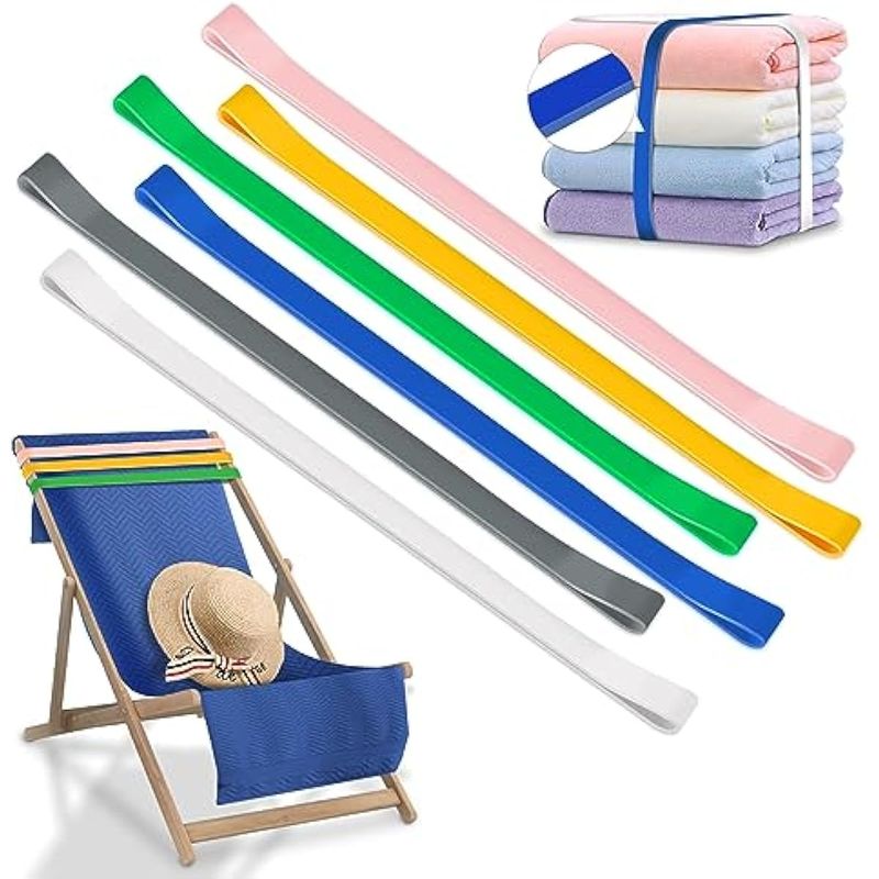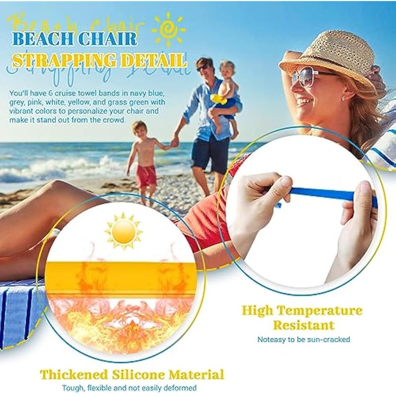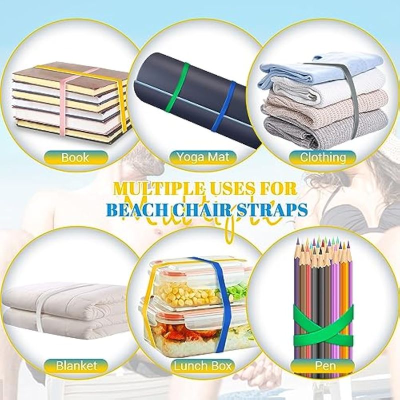 Múltiples aplicaciones: los elásticos de toalla resistentes al viento se pueden utilizar para sostener no solo toallas en sillas de playa, sino también para agrupar colchas, mantas delgadas, cojines de yoga y otras necesidades diarias, que también es adecuado para piscinas, campamentos y otras actividades al aire libre.
