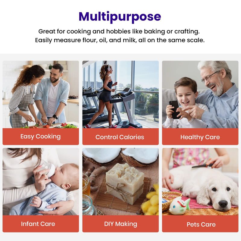 Fácil de usar: su precisa función de tara puede restablecer el peso actual en la báscula a cero, y realizar una rápida conversión de unidades; admite medición de volumen, visor retroiluminado violeta, e indicación de batería baja