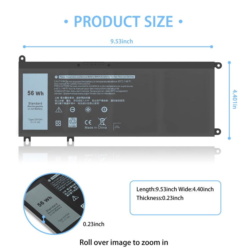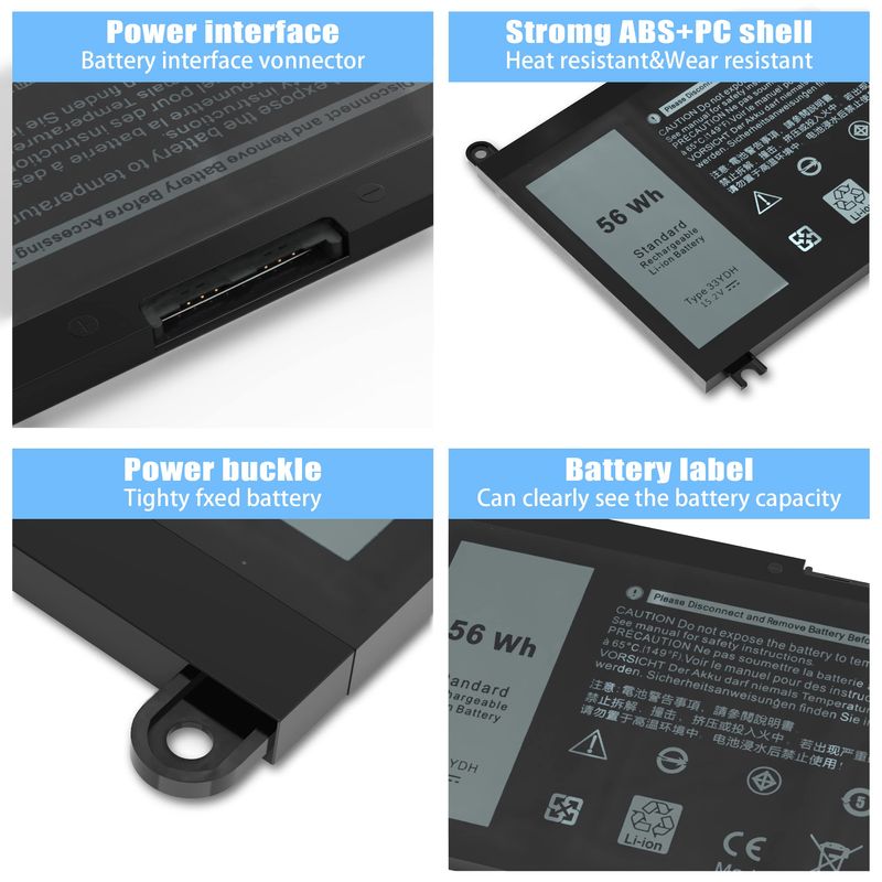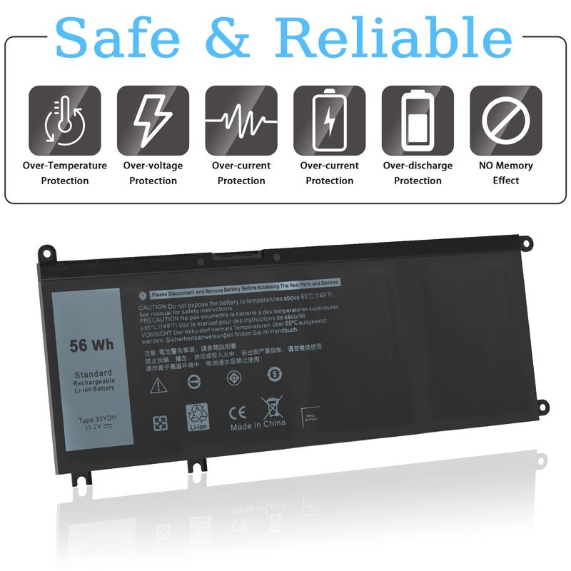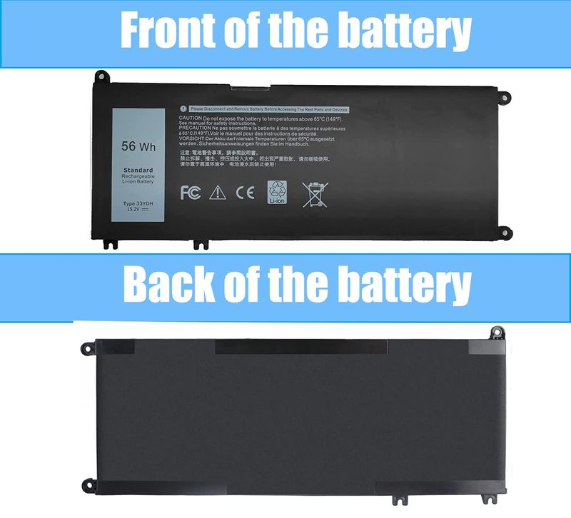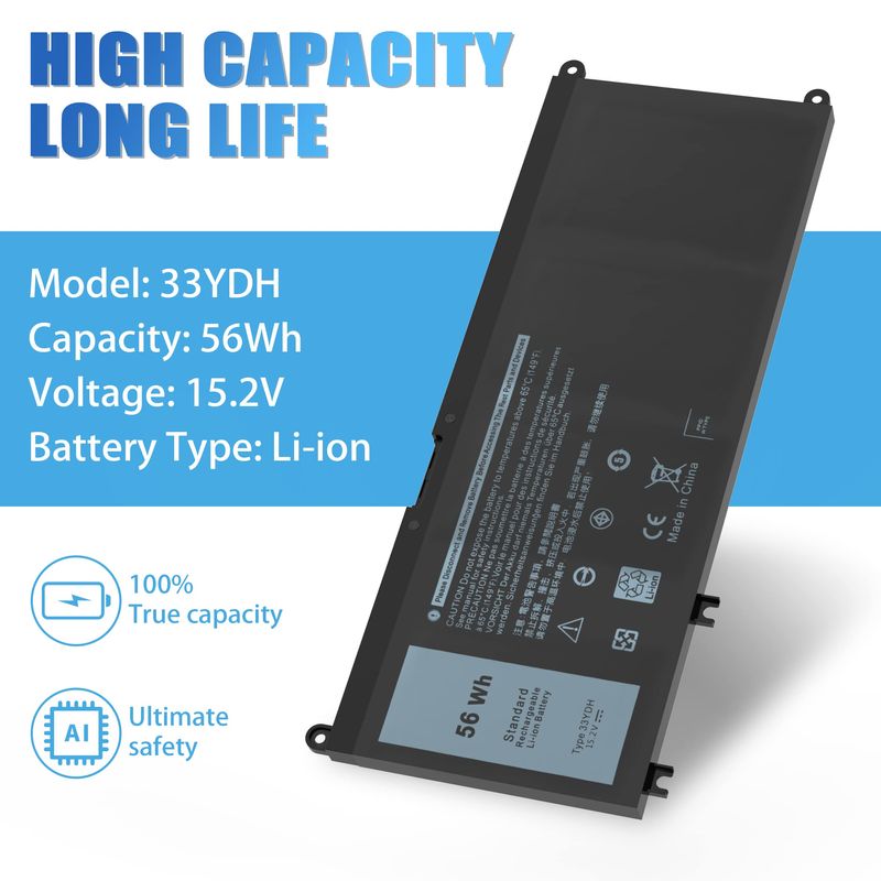 Especificaciones: modelo: 33YDH; Voltaje: 15.2 V; Capacidad: 56 Wh; Celdas: 4 celdas; Color: negro. El paquete incluye: 1 x 33YDH Reemplazo de Batería para Laptop; 2 x Destornilladores Gratis; 1 x Instrucciones para Batería de Laptop