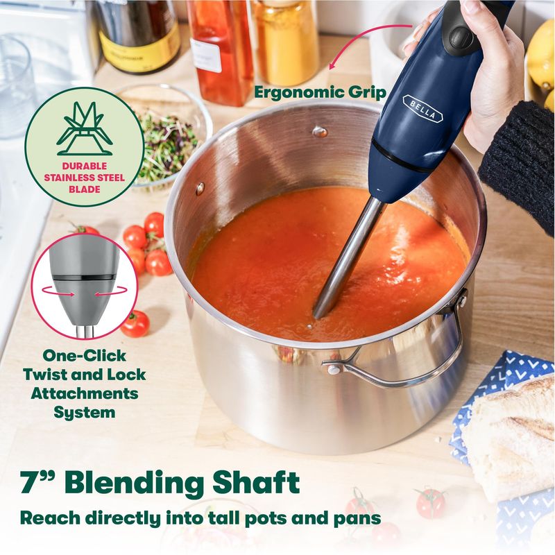 Motor de 250 W se empareja con una cuchilla de mezclado y accesorio de globo es lo suficientemente versátil para reemplazar las batidoras y mezcladores más grandes.