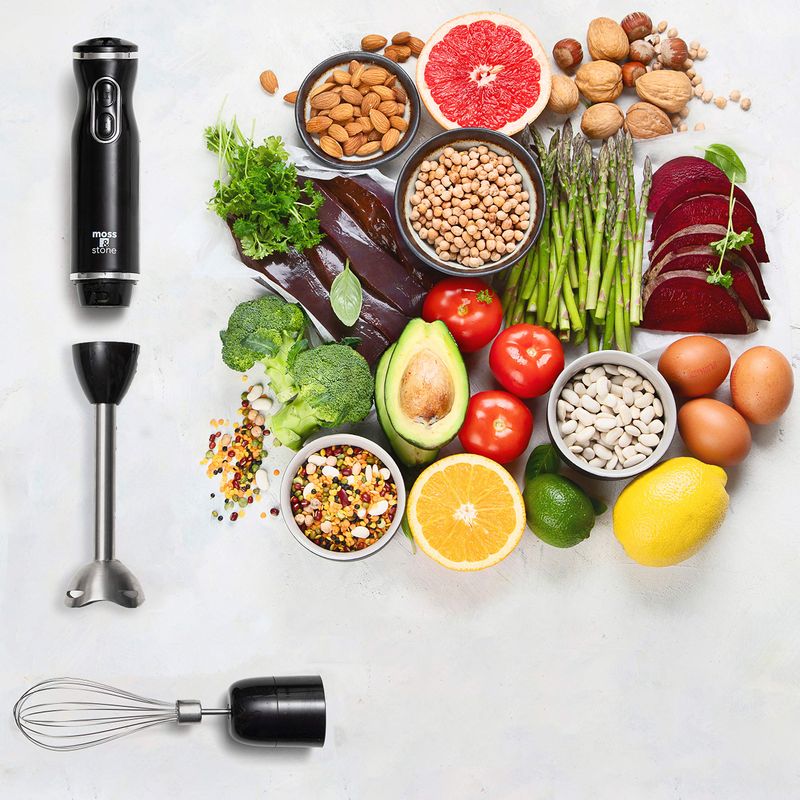 Potente batidora de inmersión de 300 vatios: nuestra batidora de mano de musgo y piedra con dos velocidades para mezclar, mezclar y picar es perfecta y adecuada para múltiples tareas de mezcla de cocina, parte de tus utensilios de cocina como máquina moledora y procesador de alimentos.