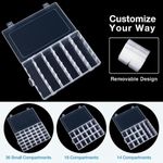 ?Amplio uso?Estas versátiles cajas transparentes son ideales para organizar y almacenar varios artículos pequeños como joyas, aretes, collares, anillos, cosméticos, hilos, cuentas, manualidades, aparejos de pesca, componentes electrónicos, uñas, manualidades y mucho más. Las cajas transparentes Benbilry son perfectas para mantener todo ordenado y fácilmente accesible.