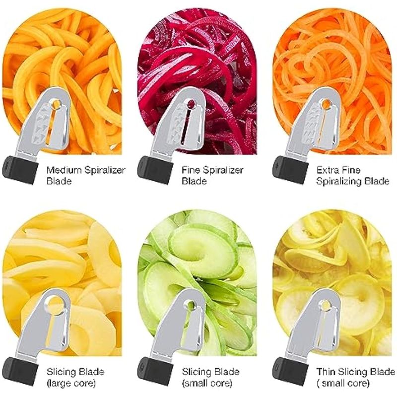Se incluyen 6 cuchillas de cambio rápido y una cuchilla de pelado de repuesto: 3 cuchillas en espiral medianas, finas y extrafinas, 3 cuchillas de corte corte de núcleo grande, rebanado de núcleo pequeño y rebanado fino, 1 cuchilla de pelar.
