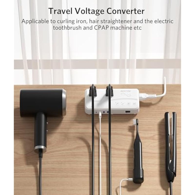 Convertidor de voltaje a 110 V: Convierta el voltaje de todos los países 110 V-240 V a voltaje de EE. UU. 110 V, lo que le permite cargar sus dispositivos de forma segura cuando viaja por todo el mundo sin preocuparse por problemas de adaptación eléctrica.