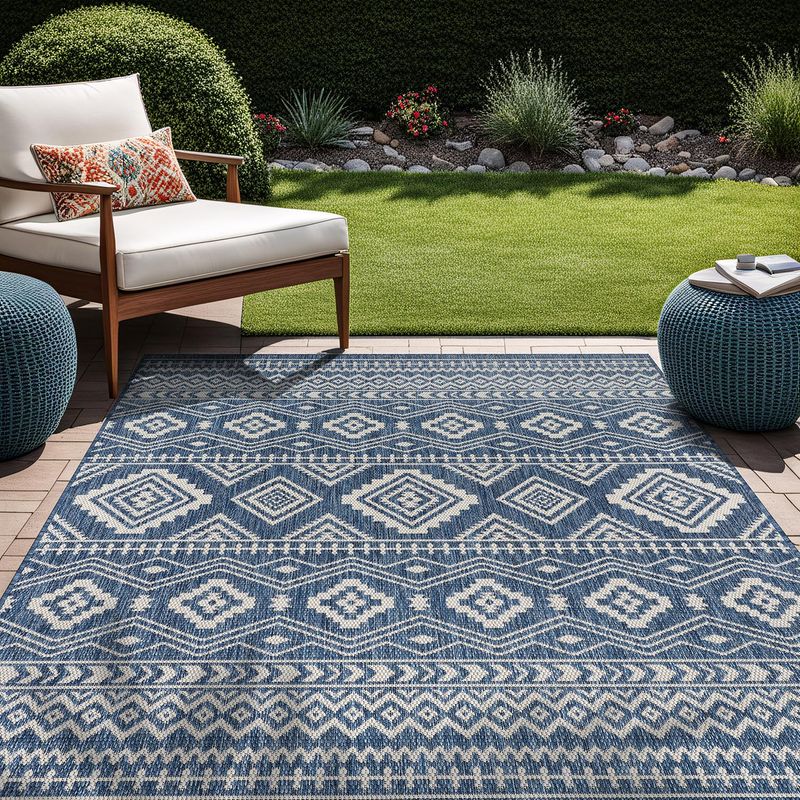 Ideales para uso en interiores o exteriores: nuestros modernos tapetes con bordes funcionan como tapetes de sala de estar, tapetes de comedor para colocar debajo de la mesa, tapetes de oficina en casa o tapetes de exteriores para patio, porche, terraza, glorieta, junto a la piscina, garaje o patio trasero.