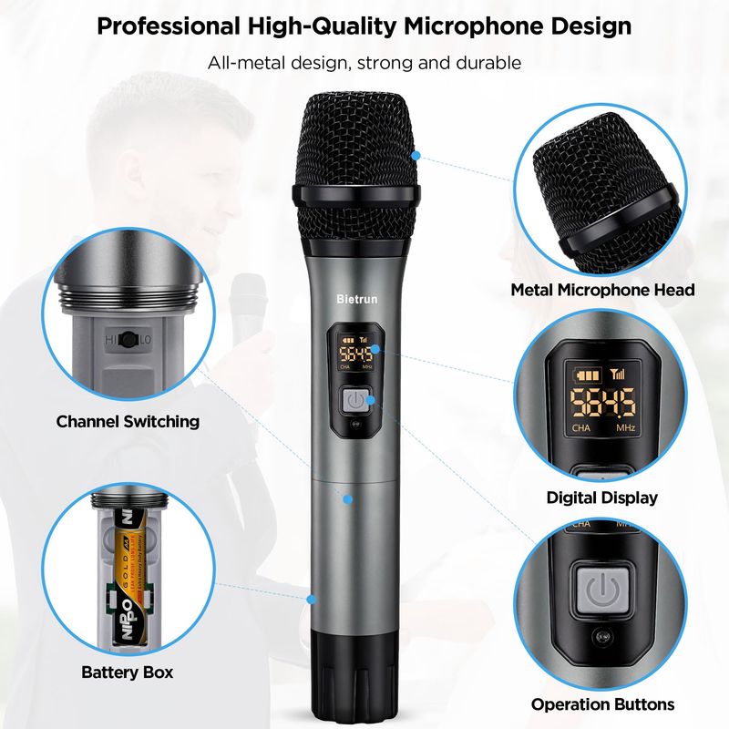 AUDIOMICROFONOSBietrun Sistema de micrófono dinámico de micrófono inalámbrico con receptor recargable, salida de