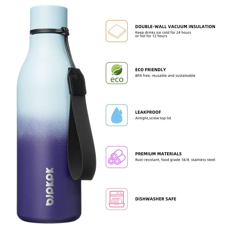 BJPKPK BOTELLAS DE AGUA AISLADAS, BOTELLA DE AGUA DE METAL DE ACERO INOXIDABLE DE 18 ONZAS CON CORREA, TERMO A PRUEBA DE FUGAS, TAZAS Y FRASCOS, BOTELLA DE AGUA REUTILIZABLE PARA LA ESCUELA, DEPORTES Y VIAJES, AZUL MARINO