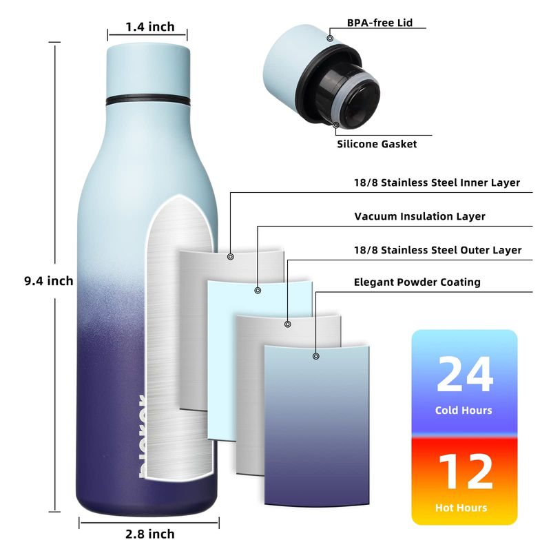 Mantén tus bebidas calientes o frías durante horas: nuestra botella de agua aislada al vacío de doble pared está hecha de acero inoxidable 188, que es conocido por sus excelentes propiedades de aislamiento. Esto significa que mantendrá tu bebida fría durante 24 horas y caliente durante 12 horas, por lo que es perfecta para la hidratación durante todo el día.