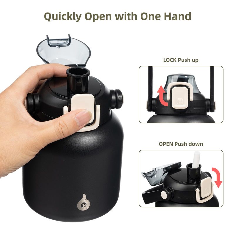 Botella de agua aislada con tapa de apertura de un solo clic: simplemente presiona el botón con una mano, la pajita saldrá automáticamente, nuestra botella de agua aislada con pajita te da una manera más fácil de beber agua. El popote es extraíble, puedes disfrutar bebiendo con popote o flujo de agua rápido sin pajilla. Esta tapa mejorada viene con un cierre de seguridad y una tapa a prueba de polvo que garantiza un consumo diario de agua 100 a prueba de fugas y saludable.