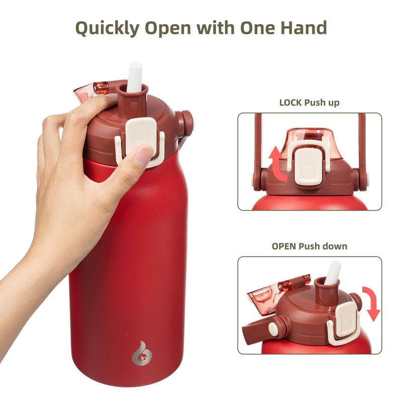 Botella de agua aislada con tapa de apertura de un solo clic: simplemente presiona el botón con una mano, la pajita saldrá automáticamente, nuestra botella de agua aislada con pajita te da una manera más fácil de beber agua. El popote es extraíble, puedes disfrutar bebiendo con popote o flujo de agua rápido sin pajilla. Esta tapa mejorada viene con un cierre de seguridad y una tapa a prueba de polvo que garantiza un consumo diario de agua 100 a prueba de fugas y saludable.