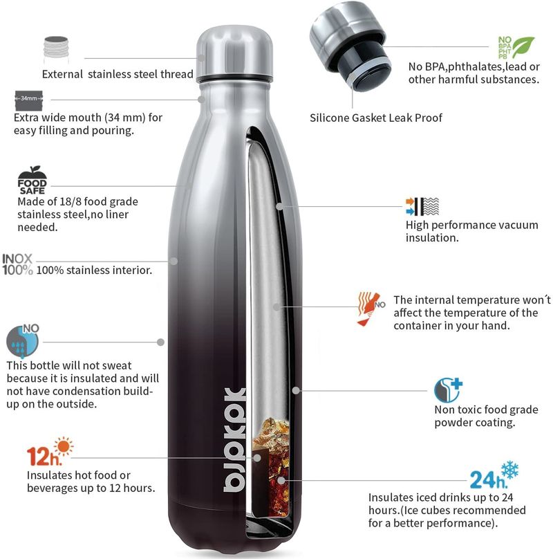 Seguro y fiable: sin BPA, hecho de acero inoxidable 188 de grado alimenticio, botella aislada al vacío de doble pared. Ecológico, sin plomo, a prueba de óxido y a prueba de fugas, sin sudor, sin condensación.