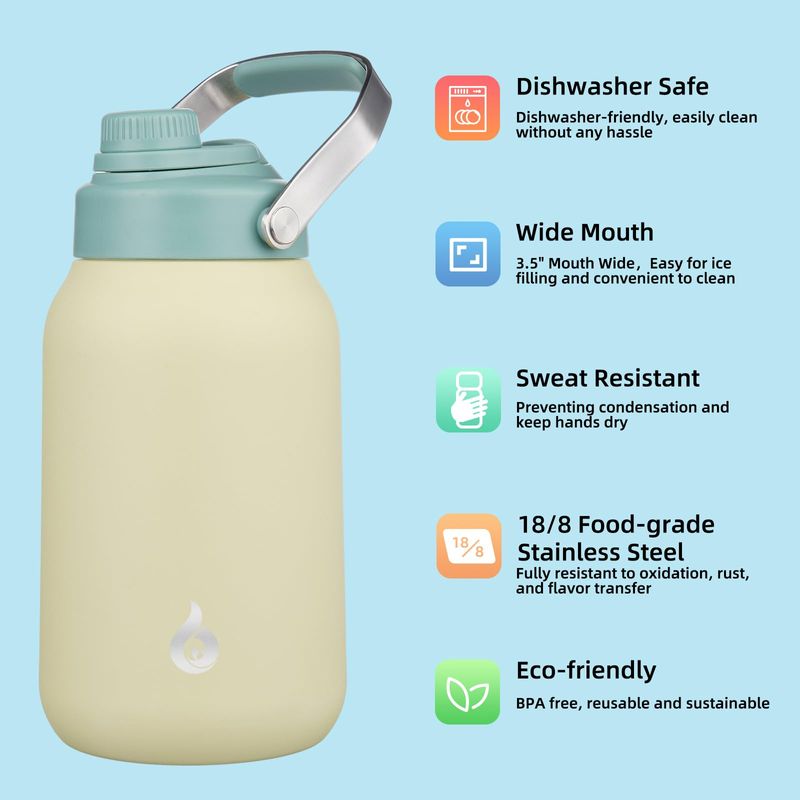 Sin BPA y regalo ideal: estas botellas de agua aisladas de 64 onzas son 100 libres de BPA y plomo. Perfecto para viajar, senderismo, ciclismo, camping, pesca, gimnasio y mucho más. Con una variedad de colores de moda, es un gran regalo para tus seres queridos para ayudarlos a mantenerse hidratados y saludables.