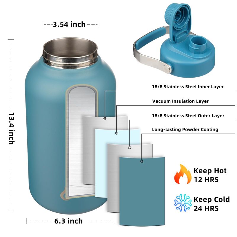 Botella de agua aislada: la botella de agua BJPKPK de medio galón utiliza tecnología de aislamiento al vacío de doble pared para mantener tu bebida fría hasta 24 horas, o caliente hasta 12 horas, asegúrate de disfrutar de tus bebidas favoritas a la temperatura más adecuada todo el día.