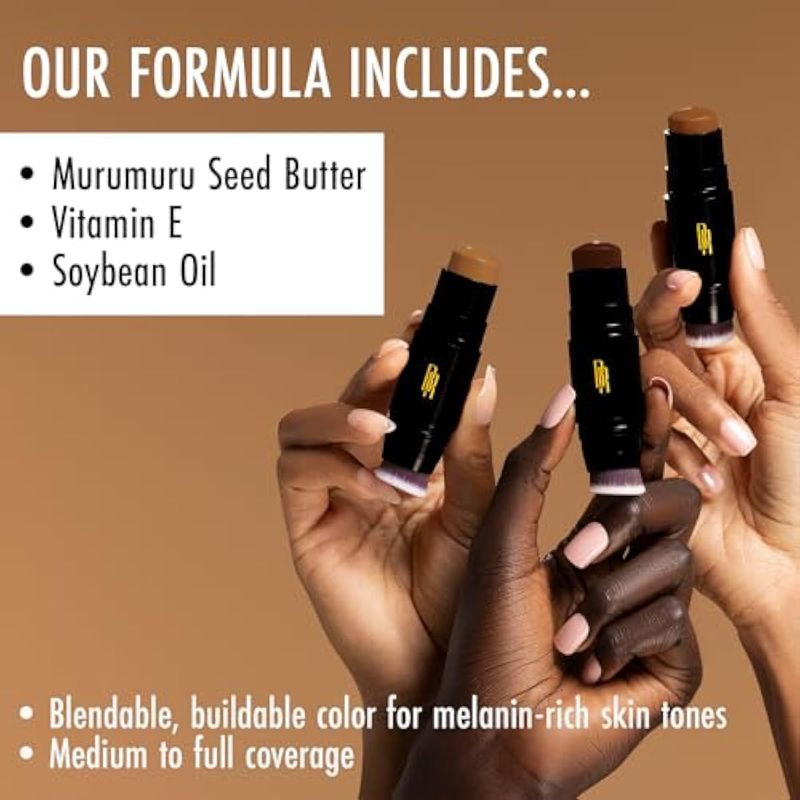 Cara: la barra de la base de maquillaje Black Radiance Color Perfect es rica en pigmento. En el otro extremo tiene una suave brocha para que tu maquillaje esté siempre a punto.