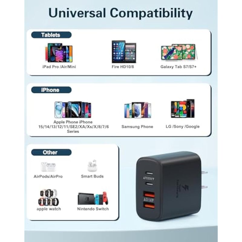 ????Compatibilidad universal: doble puerto USB-C y bloque de cargador de puerto USB-A dual compatible con iPhone 14 13 12 11 Pro Max Mini PlusXS Max XSX XR 8 7 6 6 6s Plus, Pad Pro Air Mini, AirPods Pro, Galaxy S23S22S21S21+S21 Ultra S20S20 UltraS20 UltraS20 UltraS20 UltraS20 UltraS20 UltraS20 UltraS20 UltraS20 UltraS22S21 0 FE, Nota 10, Note 20 20 Ultra S10, Galaxy Z Fold 3, A53, A71, Tab S7S7+S8S8+, LG, Google Pixel