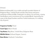 Aroma inspirado en la naturaleza: la rosa es un floral sensacional que huele a un ramo recién cortado. Una mezcla única de hojas verdes, rosas, violetas, lirios, magnolia, ámbar y aromas de madera de cedro. Cuidadosamente elaborado e infundido con flores reales en cada botella
