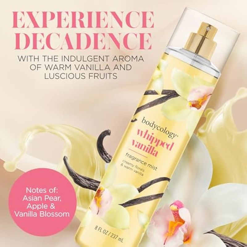 Envuélvete en una bondad fragante decadente cuando uses la fragancia Bodycology Whipped Vanilla Body Mist. Con solo un chorrito o dos antes de que comience tu día, puedes llevar contigo el maravilloso aroma de flor de vainilla, pera asiática y jazmín durante horas. Dulce y decadente, creamos esta fragancia pensando en la indulgencia. Ideal para refrescarse durante el día, puedes rociarlo en tus muñecas, cuello y hombros para una fragancia ligera. Si estás buscando algo más fuerte, te recomendamos rociar la niebla en el aire y dejar que caiga suavemente sobre tu piel. Lujosa, dulce y la cantidad perfecta de fragante, esta fragancia se convertirá rápidamente en parte de tu rutina de belleza. Esta fragancia en niebla es el seguimiento perfecto después de hidratar con nuestra crema corporal Bodycology Whipped Vanilla Shea Butter Corporal. Mezcla y combina con nuestras otras nieblas de fragancia para crear un aroma que es exclusivamente tuyo. Todos los productos Bodycology son libres de parabenos, ftalatos y crueldad.