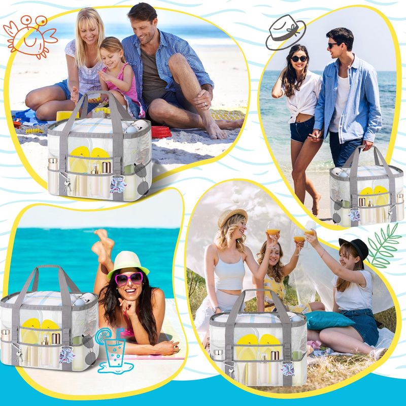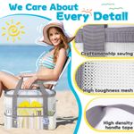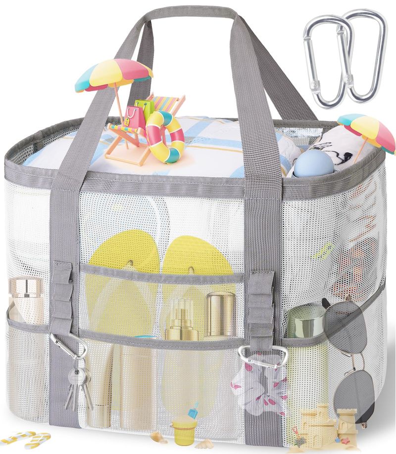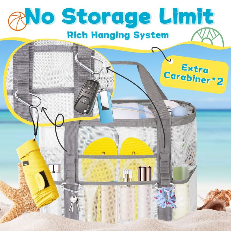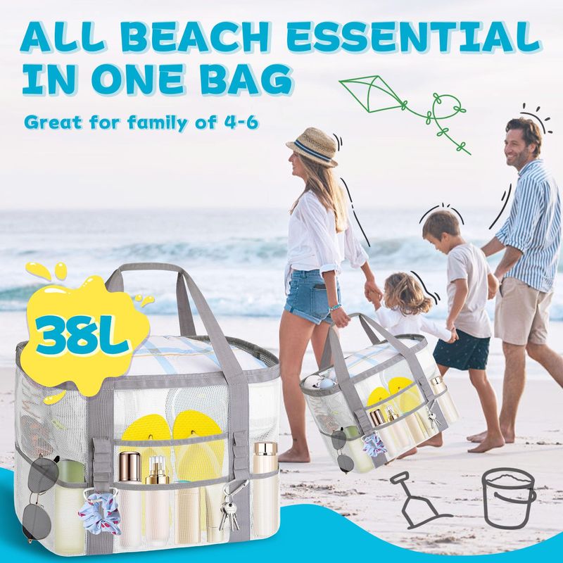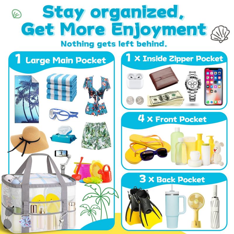 Bolsa de playa de malla XXL con 9 bolsillos para vacaciones, viajes y artículos esenciales de playa