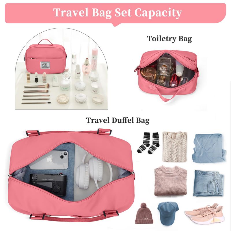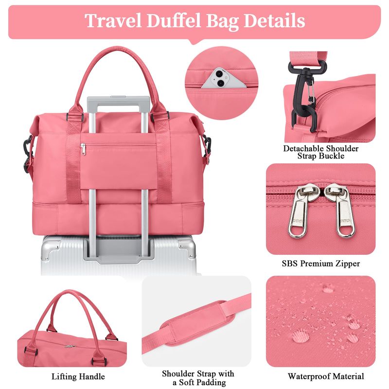 ?Bolsa de viaje con compartimento para zapatos y bolsa de aseo personal?Las bolsas de viaje para mujer tienen un compartimento separado en la parte inferior para zapatos y ropa sucia. Perfecto para el uso diario, gimnasio, estancia de una noche o un equipaje de mano. La bolsa de viaje viene con una bolsa de aseo y cosméticos, conveniente para las personas que aman viajar. El tamaño de la bolsa de aseo: 24* 7.5* 16.5CM9.4* 3* 6.12 pulgadas.