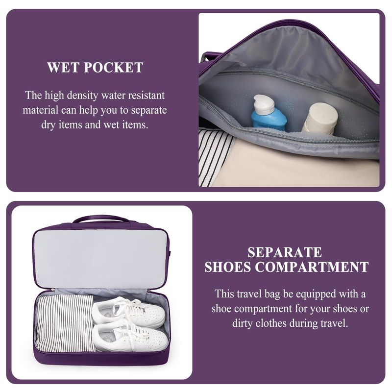 ?Bolsa de viaje con compartimento para zapatos y bolsa de aseo personal?Las bolsas de viaje para mujer tienen un compartimento separado en la parte inferior para zapatos y ropa sucia. Perfecto para el uso diario, gimnasio, estancia de una noche o un equipaje de mano. La bolsa de viaje viene con una bolsa de aseo y cosméticos, conveniente para las personas que aman viajar. El tamaño de la bolsa de aseo: 24* 7.5* 16.5CM9.4* 3* 6.12 pulgadas.