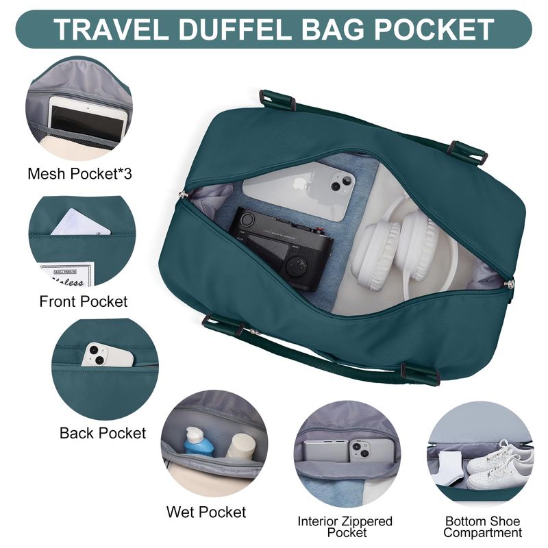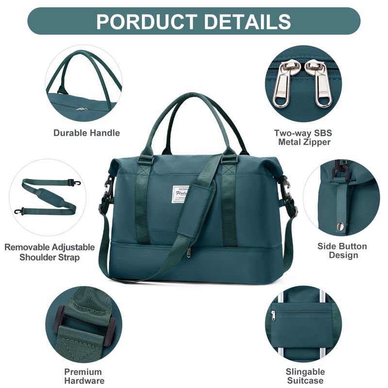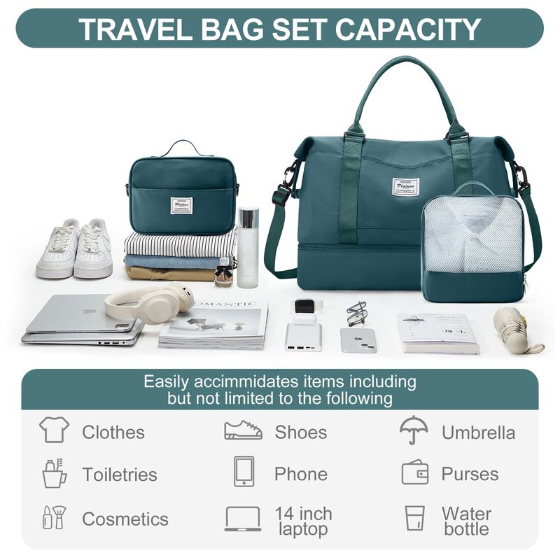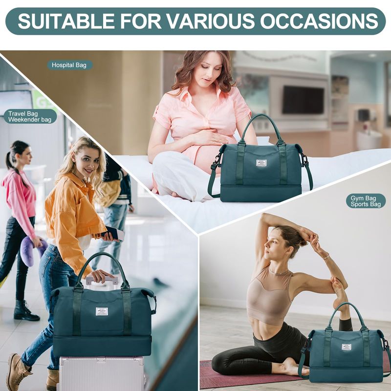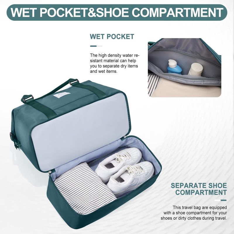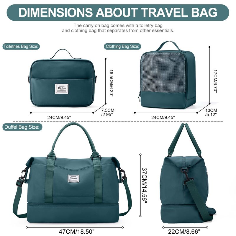 ?Bolsa de viaje con compartimento para zapatos y bolsa de aseo personal?Las bolsas de viaje para mujer tienen un compartimento separado en la parte inferior para zapatos y ropa sucia. Perfecto para el uso diario, gimnasio, estancia de una noche o un equipaje de mano. La bolsa de viaje viene con una bolsa de aseo y cosméticos, conveniente para las personas que aman viajar. El tamaño de la bolsa de aseo: 24* 7.5* 16.5CM9.4* 3* 6.12 pulgadas.