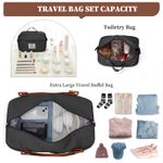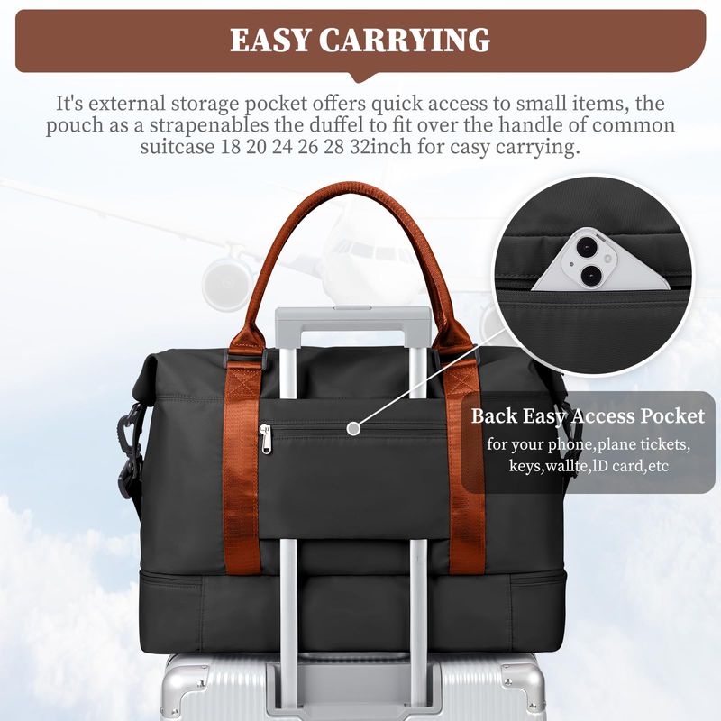 Bolsa de mano apta para avión: este tamaño de esta bolsa de fin de semana para mujer es de 18.50 x 14.1 x 8.13 pulgadas y cumple con la mayoría de los requisitos internacionales de equipaje de mano. La funda de la carretilla incorporada se desliza en el asa del equipaje de la carretilla, ahorrando esfuerzo y haciendo que sea fácil de mover. Y se puede guardar como bolsa de artículos personales en compartimentos superiores, debajo del asiento durante el vuelo.