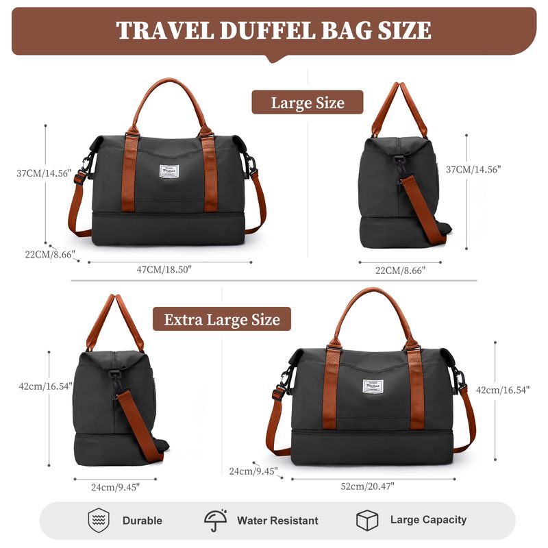 ?Bolsa de viaje con compartimento para zapatos y bolsa de aseo personal?Las bolsas de viaje para mujer tienen un compartimento separado en la parte inferior para zapatos y ropa sucia. Perfecto para el uso diario, gimnasio, estancia de una noche o un equipaje de mano. La bolsa de viaje viene con una bolsa de aseo y cosméticos, conveniente para las personas que aman viajar. El tamaño de la bolsa de aseo: 24* 7.5* 16.5CM9.4* 3* 6.12 pulgadas.