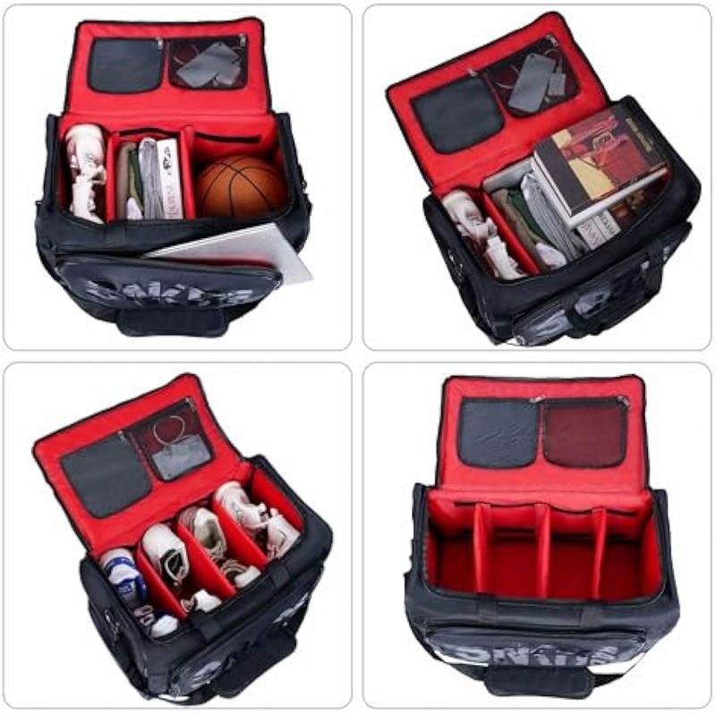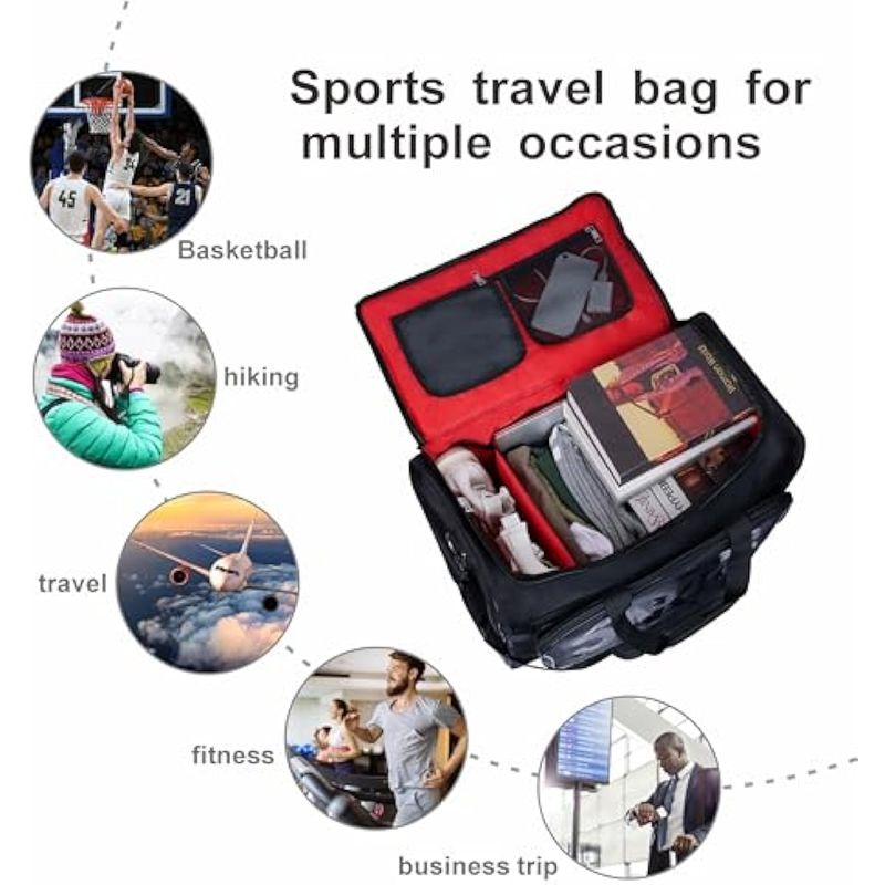 Diseño multifuncional: la bolsa de viaje para tenis para hombre cuenta con un compartimento dedicado para una laptop de 16 pulgadas para que puedas llevar tus elementos esenciales tecnológicos de forma segura mientras estás en movimiento. Pero eso no es todo: también se puede utilizar para mantener la ropa húmeda y las toallas separadas de los artículos secos. Además, dos pequeños compartimentos en la parte superior proporcionan la solución de almacenamiento perfecta para tus auriculares, teléfonos celulares, llaves, tarjetas, cargadores y otros artículos.