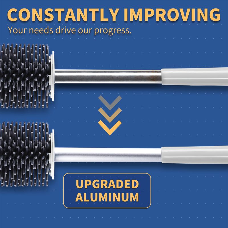 Cerdas de silicona y varilla de aluminio: las cerdas están hechas de silicona suave, que no daña el esmalte y limpia eficientemente el borde del inodoro. El material de la varilla de aluminio mejorado evita la oxidación