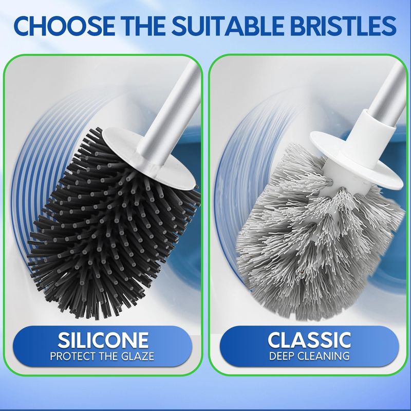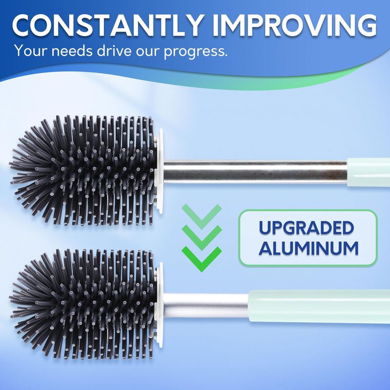 Cerdas de silicona y varilla de aluminio: las cerdas están hechas de silicona suave, que no daña el esmalte y limpia eficientemente el borde del inodoro. El material de la varilla de aluminio mejorado evita la oxidación