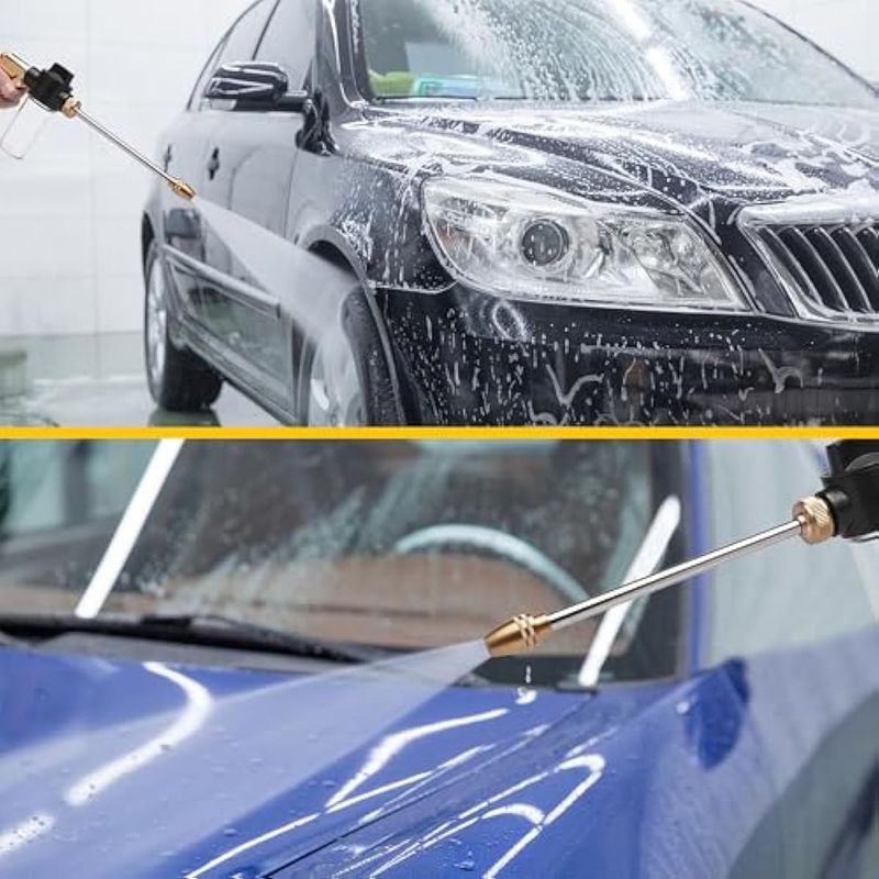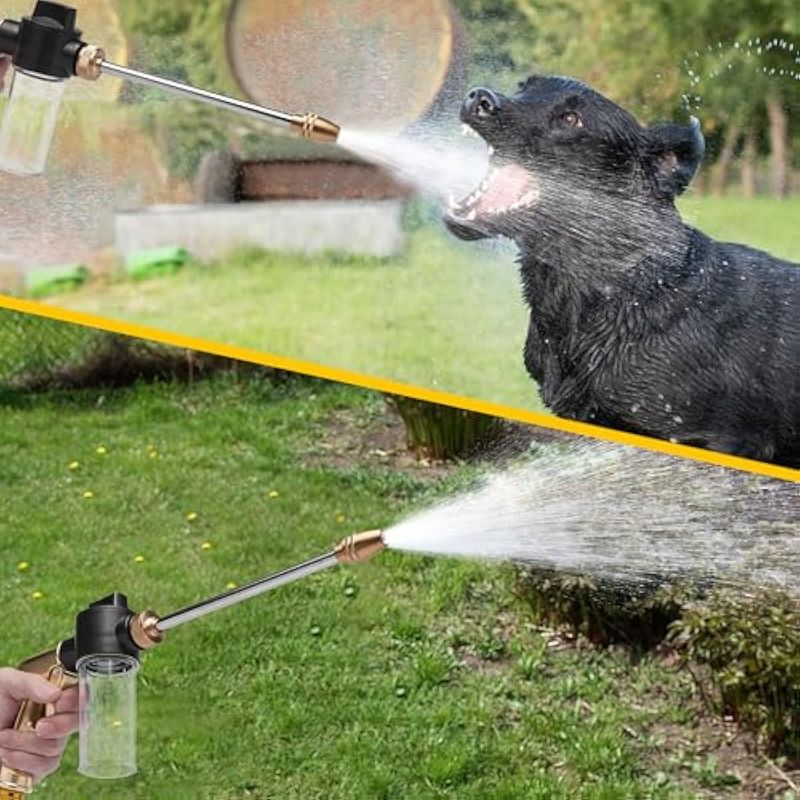 ?Relación de espuma y pulverización de agua son ajustables?Al girar la cabeza de la pistola de metal, la forma del aerosol cambiará de pulverización directa a pulverización de ventilador. Hay un interruptor giratorio en la botella de jabón para cambiar la proporción de espuma de acuerdo a sus necesidades, lo cual es muy práctico.