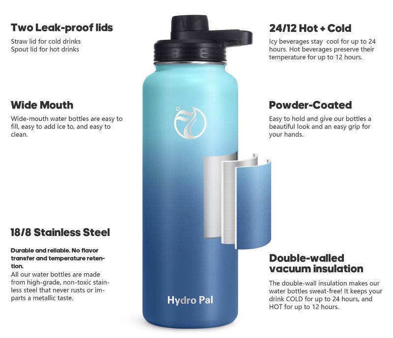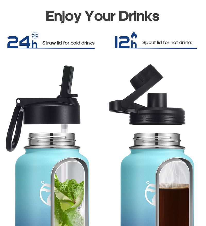 La botella de agua aislada está disponible en 2 tapas que se pueden cambiar en cualquier momento: 1 tapa con pajilla abatible y 1 tapa de boquilla fácil de girar. Todas las tapas son 100 a prueba de fugas, por lo que puedes beber sobre la marcha sin derrames, y no te preocupes por mojarte y ponerlas en tu bolsa. Ambos permiten beber fácilmente con una sola mano o manos libres.