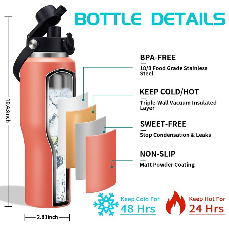 JARDÍNCAMPINGTERMOSBotellas de agua aisladas de acero inoxidable de 40 onzas, frías de 48 horas y calientes 24 horas,