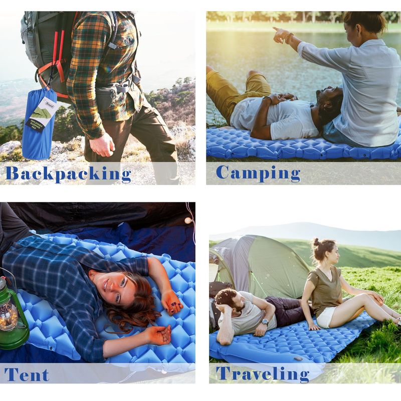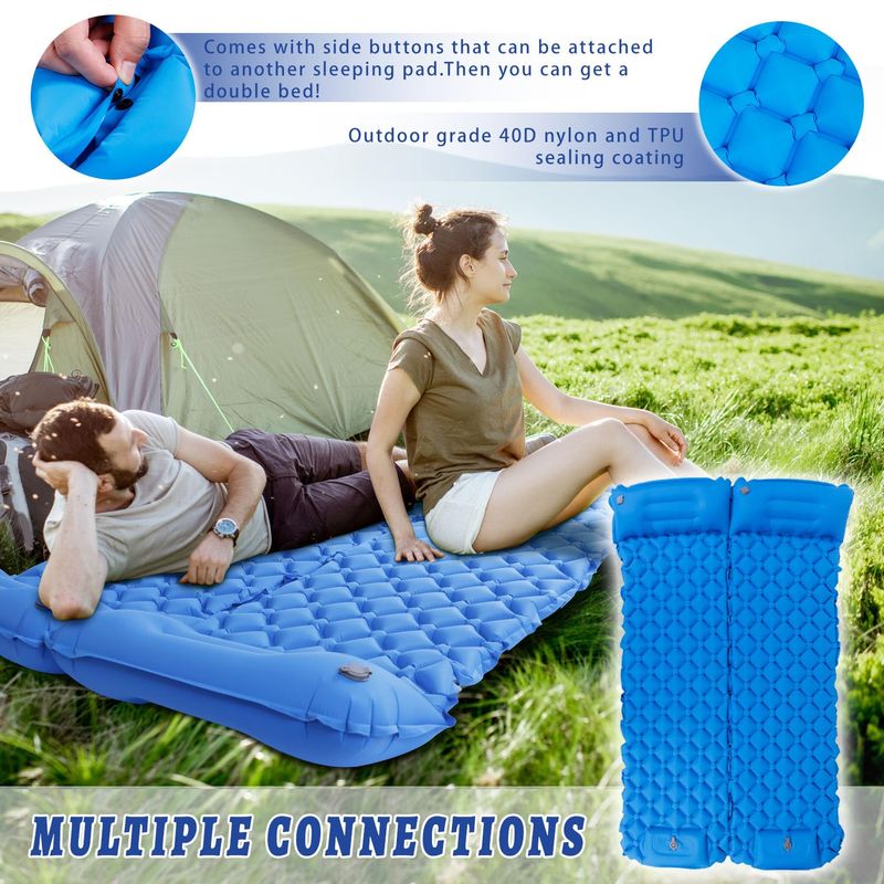 Obtén uno más para una cama individual: equipado con broches laterales, puedes fijar uno a otro tapete de campamento para hacer una almohadilla de dormir doble. El ancho de dos almohadillas conectadas entre sí puede alcanzar hasta 45.7 pulgadas, lo que te da un espacio más relajante para dormir lo suficiente. Es perfecto para compartir espacio sin preocuparte por rodar una almohadilla estrecha por la noche. ¡Llévalo y disfruta de tu maravilloso viaje de campamento!