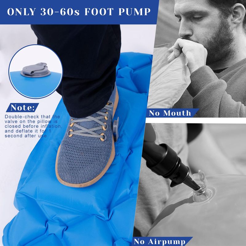 Bomba de pie, infla con facilidad: con bomba de pie integrada, esta colchoneta de dormir se puede inflar completamente en 30-40 segundos. No más inflar colchones con la boca o cargar alrededor de una bomba separada, hace que dormir al aire libre sea muy fácil. Y hay películas antifugas en las válvulas, nunca te preocupes por fugas de aire cuando las usas, ahorrando energía y tiempo para hacer más desafíos