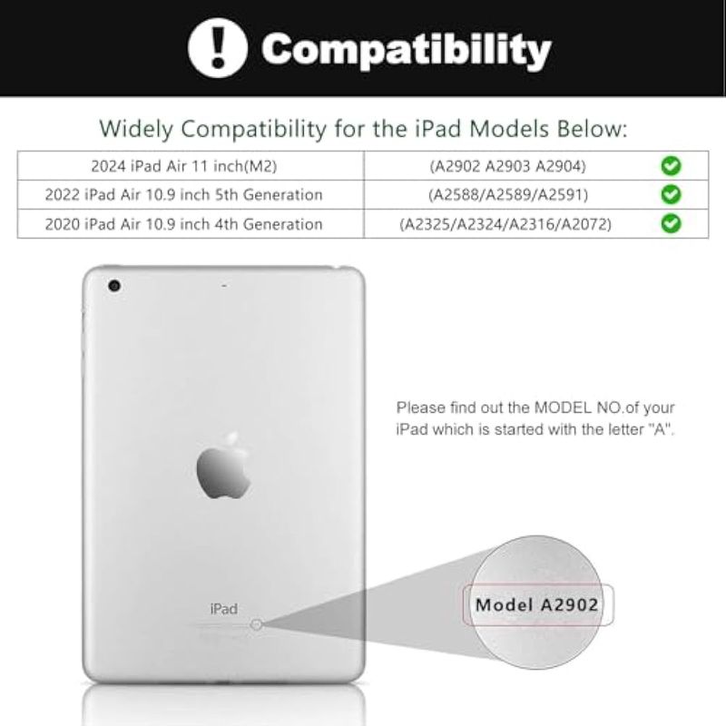 Esta funda con teclado para iPad es compatible con iPad Air de 11 pulgadas M2 2024 A2902 A2903 A2904, compatible con iPad Air de 10.9 pulgadas 5ª generación 2022 A2588 A2589 A2591, compatible con iPad Air de 10.9 pulgadas de 4ª generación 2020 A2020 325 A 2324 A2316 A2072, compatible con iPad Pro de 11 pulgadas de 1ª generación 2018 A1980A1934A1979A2013. Comprueba el modelo de tu iPad antes de comprar.
