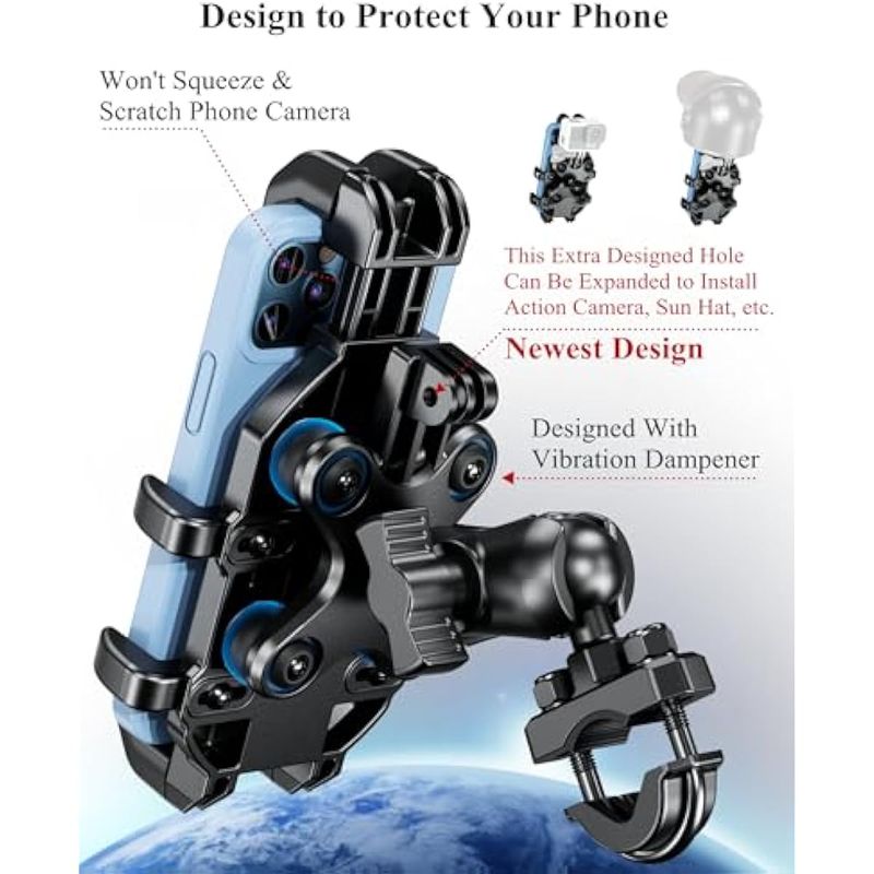 Anti-choque, protege la cámara del teléfono móvil: Equipado con amortiguador de vibraciones, maximiza la absorción de las vibraciones causadas por la conducción. El soporte para teléfono de motocicleta también está integrado con silicona suave que evita arañazos y vibraciones. El soporte para teléfono y la cámara del teléfono cuentan con un diseño sin contacto diseñado para evitar que la cámara del teléfono se apriete y se raye mientras conduces