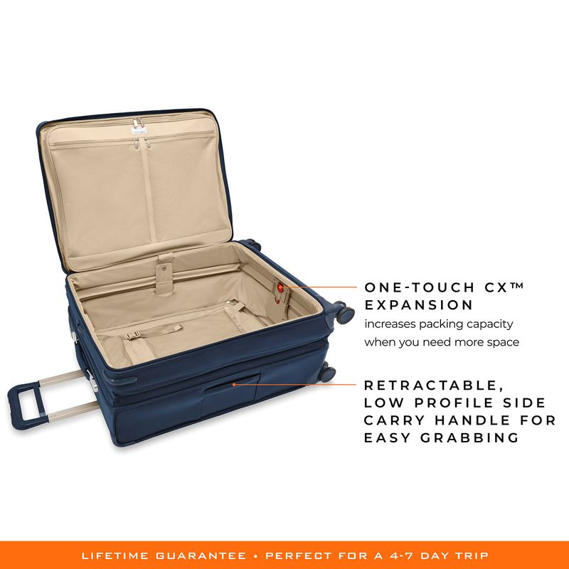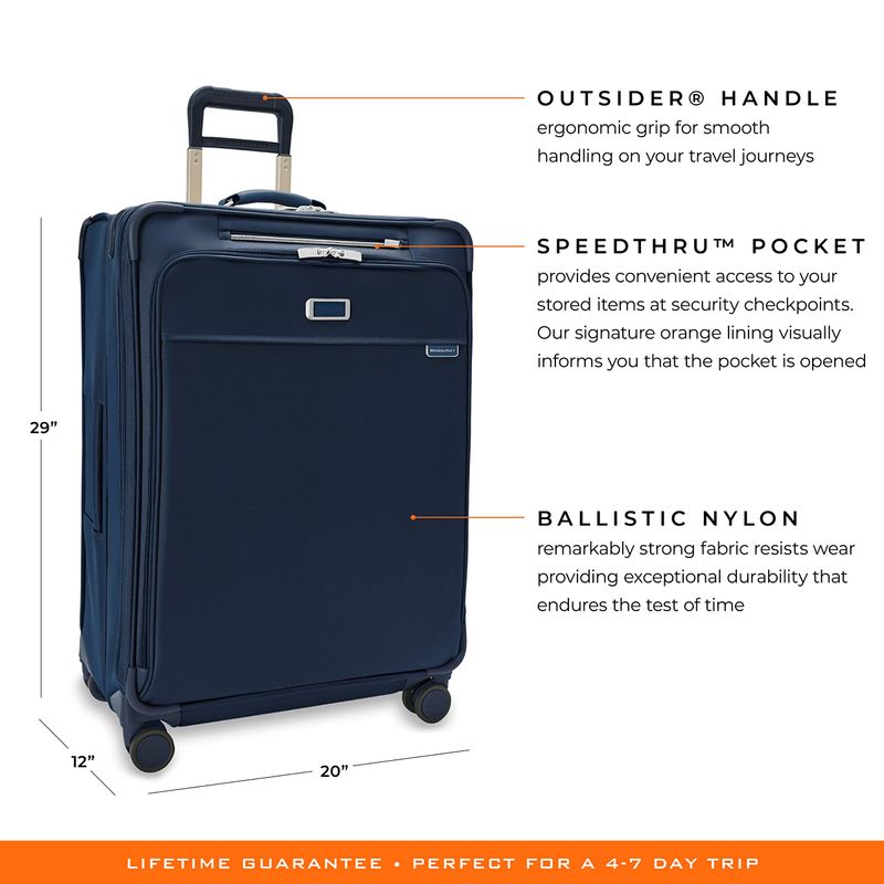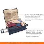 El equipaje de mano Briggs & Riley Essential de 2 ruedas 22 x 14 x 9 pulgadas cumple con las regulaciones de mano para la mayoría de las aerolíneas nacionales de Estados Unidos. El asa de tela inferior integrada y las asas laterales retráctiles de perfil bajo ofrecen diferentes formas de guardar tu equipaje. ¿Necesitas más espacio? Nuestra correa extraíble SmartLink™ te permite transportar cómodamente 2 bolsas como una sola. Simplemente coloca la barra en T de la correa de añadir una bolsa a la base de acoplamiento, luego colócala a través del asa para una segunda bolsa para mayor comodidad. La sustancial protección contra la parte superior con material resistente a los impactos ayuda a proteger tu equipaje, asegurando durabilidad durante innumerables millas. Este equipaje de mano también ofrece un gran bolsillo frontal y 2 bolsillos de malla con cremallera para optimizar el uso del espacio y almacenamiento adicional para todos tus artículos esenciales de viaje. Los paneles de ropa de primera calidad envuelven tu ropa con un mínimo de arrugas. El ajuste de las correas añade compresión, reduciendo el desplazamiento en tránsito. Las ruedas giratorias patentadas que absorben los golpes ofrecen una maniobrabilidad de 360 y un deslizamiento silencioso suave para una navegación sin esfuerzo. Diseñado con cremalleras YKK RC autoreparables que requieren una acción suave de cremallera con tiradores de cremallera bloqueables. La bolsa se puede limpiar con un paño suave y húmedo o un rodillo de cepillo adhesivo de pelusa. Si tu bolsa está rota o dañada, la repararemos de forma gratuita, no necesita prueba de compra, sin hacer preguntas.