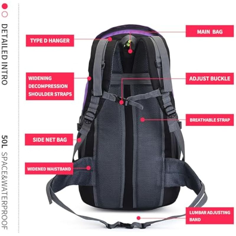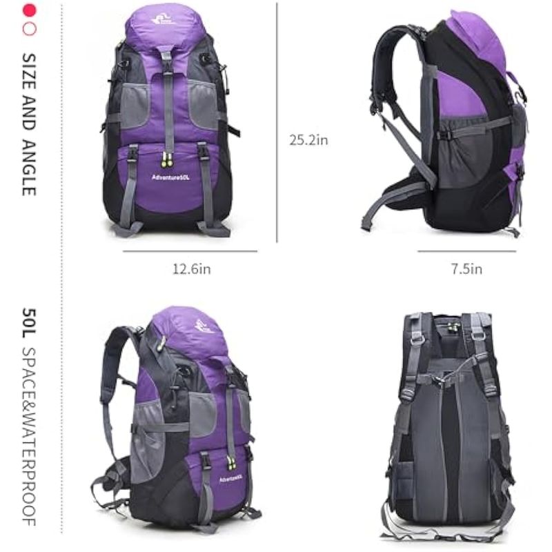 BSEASH MOCHILA DE SENDERISMO RESISTENTE AL AGUA DE 50 L, BOLSA DE VIAJE LIGERA PARA DEPORTES AL AIRE LIBRE PARA ACAMPAR, ESCALAR, TURISMO, MORADO - SIN COMPARTIMENTO PARA ZAPATOS, MOCHILAS DAYPACK