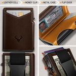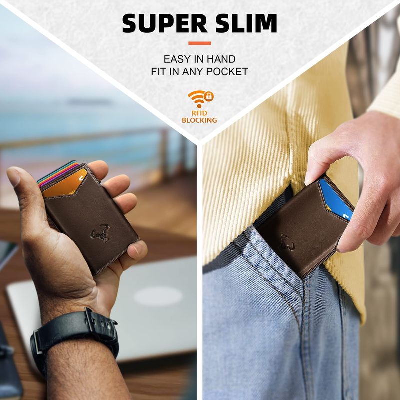 Capacidad: cartera delgada con diseño refinado para caber en el bolsillo frontal, fácil para 8 tarjetas y un par de billetes: 5 tarjetas en la caja de aluminio con acceso emergente, 3 tarjetas en la carcasa de cuero