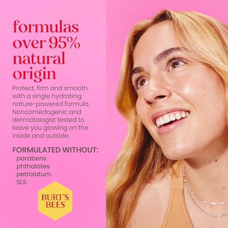 Trae de vuelta naturalmente el resplandor de la piel mientras reduces la apariencia de líneas y arrugas con la loción reafirmante de día de Burt's Bees. Clínicamente demostrado que reduce el aspecto de arrugas profundas y mejora la firmeza de la piel con los mejores ingredientes naturales en una crema hidratante ligera con SPF 30. Esta crema hidratante de rápida absorción tiene protección solar UVA UVB natural de amplio espectro para ayudar a prevenir daños por los rayos UV, la principal causa de arrugas prematuras. Con un poco de acción de bomba, la piel está inmediatamente más hidratada y protegida para que puedas decir adiós a la sequedad y hola a la piel renovada visiblemente más joven. Nuestra fórmula nutritiva mantiene la barrera de humedad de tu piel para una piel que se ve saludable y flexible, para una belleza atemporal. Dale a tu piel el cuidado amoroso que merece con esta loción facial probada por dermatólogos con SPF que está hecha de 98.9 de origen natural con botánicos ricos en nutrientes. Obtén sensaciones limpias y nutritivas del poder de la colección de Burt's Bees Skin Renewal.