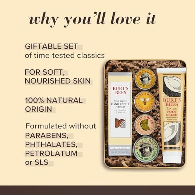 Burt's Bees Juego de regalos clásicos, 6 productos en lata de regalo, crema para cutículas y cestas
