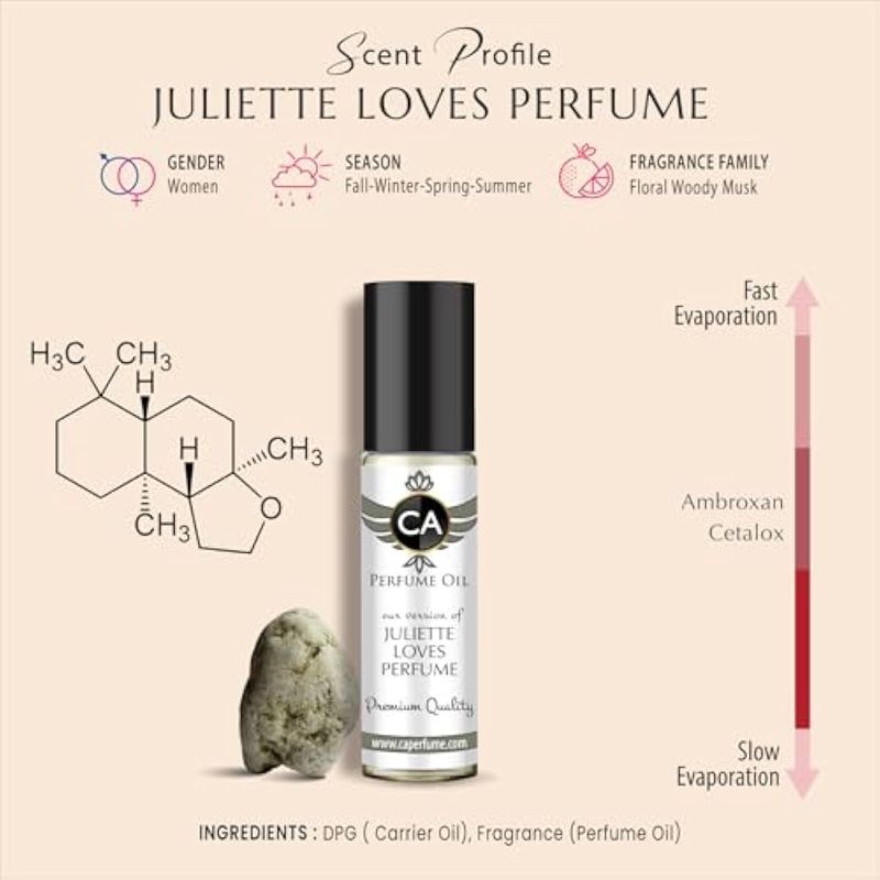 Perfil de fragancia: el perfume Juliette Loves de CA Perfume es una fragancia floral de almizcle amaderado para mujeres. Las notas son Ambroxan y Cetalox. Not A Perfume se lanzó en 2010.