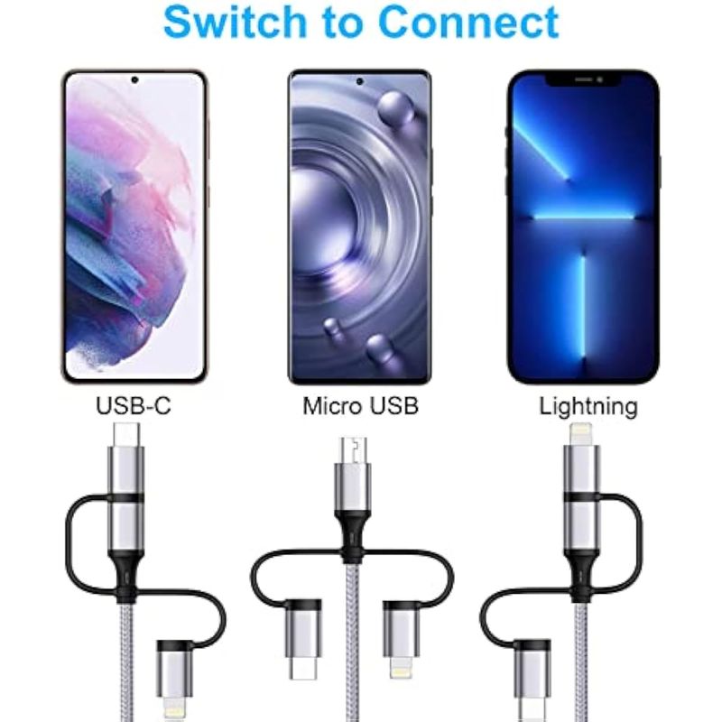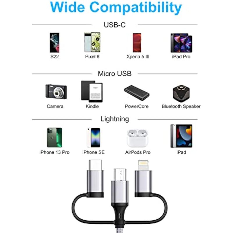 Cable de carga múltiple 3 en 1: adaptador integrado 3 en 1 para cargar dispositivos Lightning y Android Micro USB y tipo C por lo que solo necesita un cable para todos sus dispositivos.