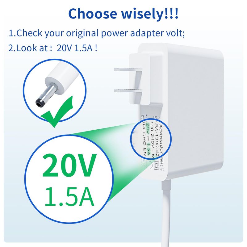 Compatible con: SA18C47124SA18C72851SA18C57982; la fuente de alimentación es de 20V 1.5A y el enchufe de CC es de 4.0X1.0.276 in, comprueba las especificaciones de tu propio cargador para la compatibilidad