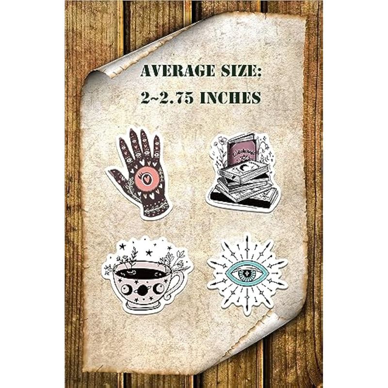 1. 50 calcomanías estéticas diferentes y únicas y tamaños de 2 a 2.75 pulgadas. Son de diseño celestial, también algunos tienen un estilo espeluznante o hippie.