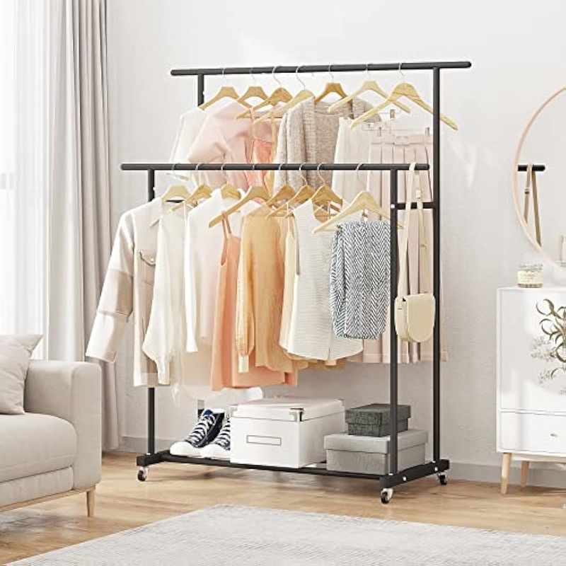 CALMOOTEY PERCHERO DE ROPA DE DOBLE BARRA, ORGANIZADOR DE ROPA PORTáTIL PARA DORMITORIO, SALA DE ESTAR, TIENDA DE ROPA, NEGRO