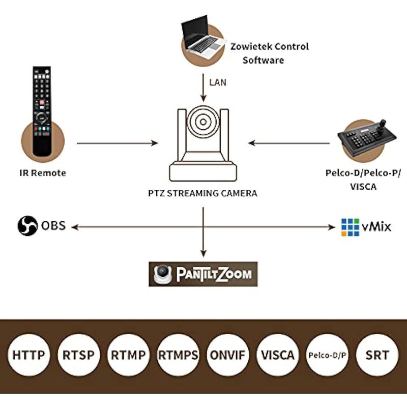 Transmisión sencilla: la cámara PTZ admite protocolos SRT, RTSP, RTMP y modo push RTMP, servidor multimedia de transmisión fácil de vincular Wowza, FMS
