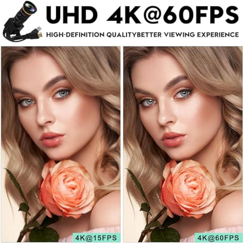 Cámara 4K de alta velocidad USB3.0 de 60 FPS: Esta cámara USB 3.0 4K de alta velocidad de 60 fps ofrece un rendimiento excepcional, admitiendo una resolución máxima de 3840x2160 con velocidades de cuadro de 60 fps en formatos MJPEG o H.264. Además, la salida HDMI permite una transmisión sin problemas de 4K a 60 fps, proporcionando imágenes ultra suaves y fluidas.